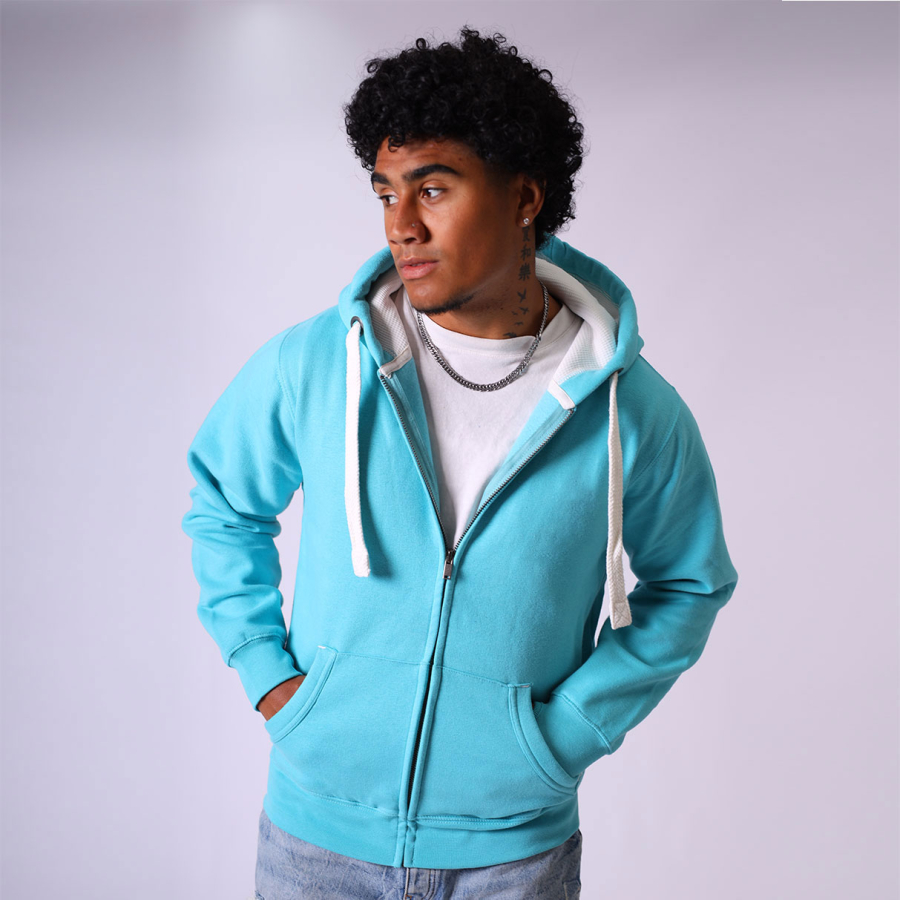 Made from Heavyweight UltraSoft Peach Finish fabric. panel waffle lined fabric hood with Ecru flat chunky hood cords. Kangaroo pouch pocket with concealed iPod and phone pocket. Ribbed hem and cuff with thumb hole.